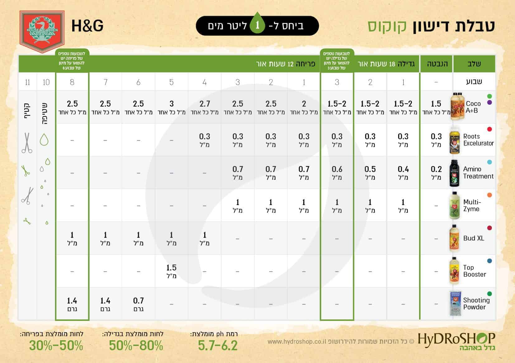 ב- CANNAZYM וב-CANNABOOST אין להשתמש יותר מ-4 ימים במאגר. תוסיפו COCO A ראשון למאגר תערבבו היטב ורק לאחר מכן תוסיפו את B